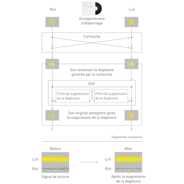 Cette fonction mesure la caractéristique de diaphonie de la cartouche installée en utilisant le signal de mesure de diaphonie enregistré sur le registre d'étalonnage fourni avec le SU-R1000. Le suppresseur effectue ensuite une correction inverse à l'aide du DSP intégré pour obtenir une amélioration significative de la caractéristique de diaphonie. Il en résulte une image sonore plus précise et une ambiance sonore plus large.