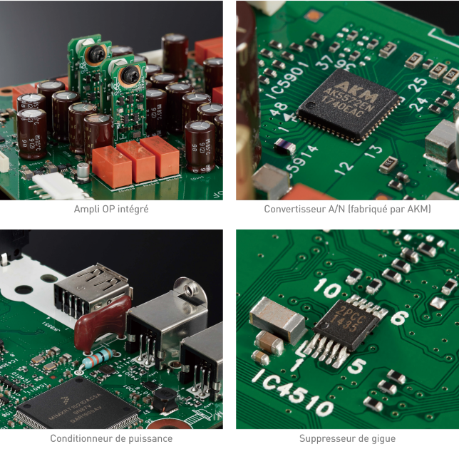 La section d'entrée phono et la section d'entrée analogique présentent une conception de circuit entièrement intégrée. Technics réalise ainsi la configuration de circuit symétrique idéale et a effectué des réglages méticuleux. Les nouveaux circuits préviennent les interférences entre les canaux droit et gauche et assurent une excellente séparation des canaux. De plus, la section d'entrée phono et la section d'entrée XLR utilisent une transmission complètement équilibrée pour assurer une transmission de signal de haute pureté avec un minimum d'effet de bruit. Le circuit d'entrée USB dans la section d'entrée numérique est équipé d'un condensateur de mica rubis de haute qualité et d'un conditionneur de puissance avec des résistances à film de carbone non magnétique pour bloquer le bruit électrique provenant par exemple d'un PC et pour minimiser l'effet du bruit externe. Le convertisseur A/N intègre une puce haute performance fabriquée par Asahi Kasei Microdevices (AKM) pour une conversion A/N de haute précision. Ainsi, le SU-R1000 reproduit une qualité sonore exceptionnelle à partir de toutes les sources d’entrées analogiques ou numériques.