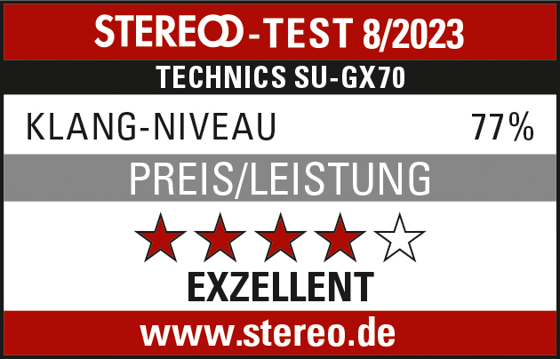 "Der Technics SU-GX70 erweist sich im Testbetrieb als Volltreffer. Optisch sehr nobel, zugleich zurückhaltend, überzeugt er bereits mit hochwertiger Verarbeitung, praktischer Handhabung, tadelloser App und exzellenter Netzwerk-/Multimedia-Ausstattung. Klanglich punktet der SU-GX70 mit einem klar strukturierten, kultivierten, homogenen Klang bei nahezu jedem Musikstil."