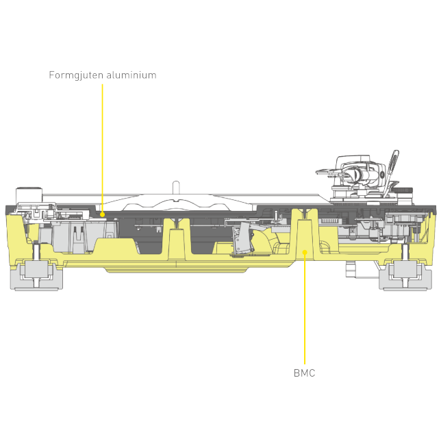 Tallriken uppnår vridstyvhet och vibrationsdämpande egenskaper med hjälp av en två-skikts-konstruktion med dämpande gummi över hela den bakre ytan av det formgjutna aluminiumet för att eliminera onödig resonans som annars överförs till skivan, och ger därför ett klarare ljud.