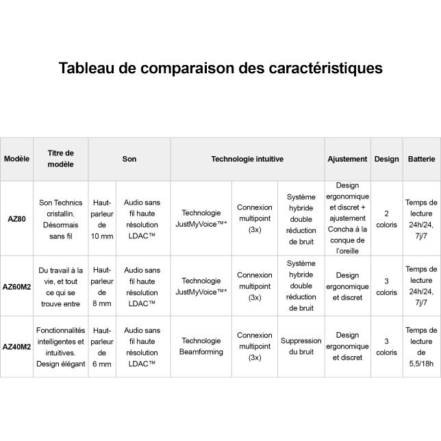*Le logo « Hi-Res Audio Wireless » Logo est utilisé sous licence de la Japan Audio Society. *LDAC et le logo LDAC sont des marques commerciales de Sony Corporation. *Amazon, Alexa et tous les logos connexes sont des marques commerciales d’Amazon.com ou ses filiales. Alexa n’est pas disponible dans toutes les langues ni dans tous les pays. Les options et fonctionnalités Alexa peuvent être différentes selon l’endroit. *Google, Android et Google Play sont des marques commerciales de Google LLC. *L’inscription et les logos Bluetooth® sont des marques déposées par Bluetooth SIG, Inc. et tout usage qui en est fait par Panasonic Corporation est sous licence. Les autres marques et noms commerciaux sont les propriétés de leurs propriétaires respectifs.