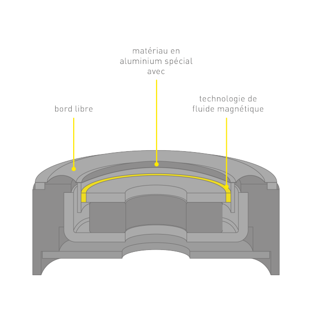 Le nouveau pilote 10 mm utilise un diaphragme de 5 microns d’épaisseur, composé d’un matériau en aluminium spécial Assistanceà haute résistance qui supprime les vibrations indésirables, ainsi que d’un matériau souple à bords libres. Fabriqué dans un matériau en aluminium spécial, il contribue à améliorer la reproduction du son haute fréquence. Le matériau à bord libre, quant à lui, diminue la fréquence de résonance la plus basse pour obtenir une reproduction sonore exceptionnelle, à basse fréquence. De plus, un fluide magnétique est utilisé dans la bobine acoustique pour optimiser ses caractéristiques et ainsi assurer une grande précision de mouvement à la membrane à bords souples et ainsi obtenir un effet d’amortissement élevé, ce qui était auparavant très difficile. Ceci permet la reproduction du son sur une large gamme de fréquences, avec une distorsion extrêmement faible.