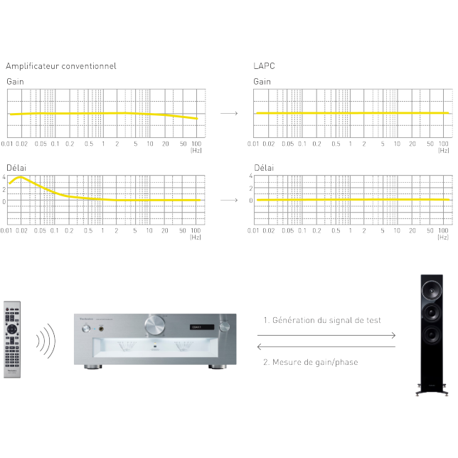 L'impédance des haut-parleurs change à chaque fréquence. Un amplificateur de puissance est requis pour alimenter ces derniers sans être affecté par leurs caractéristiques Cependant, les amplificateurs numériques conventionnels sont connectés aux haut-parleurs via un filtre passe-bas à l'étage de sortie. Ils sont donc encore plus affectés par les caractéristiques d'impédance des haut-parleurs. Par ailleurs, malgré l'amélioration des caractéristiques d'amplitude des amplificateurs conventionnels résultant du bouclage acoustique négatif, les caractéristiques de phase n'ont pas pu être améliorées. Nous avons donc développé un algorithme d'optimisation adaptative d'impédance de haut-parleur, lequel assure la correction pour obtenir une réponse d'impulsion idéale via le traitement du signal numérique, en mesurant les statistiques d'amplitude/de phase de fréquence de l'amplificateur auquel les haut-parleurs sont connectés Cette nouvelle technique assure l'aplatissement des caractéristiques d'amplitude et de phase de fréquence, qui n'était auparavant pas mis en œuvre par les amplificateurs, tout en diffusant un son présentant une expression spatiale riche.