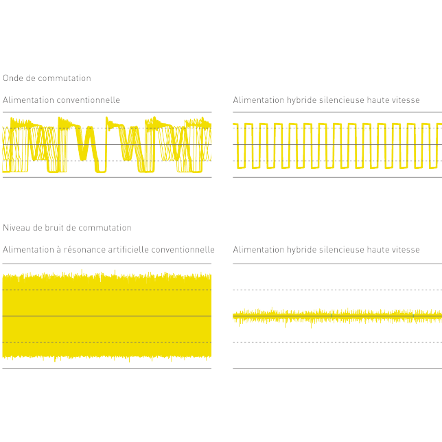 Avec une alimentation en mode de commutation conventionnelle, les fréquences de commutation changent en fonction de la fluctuation de la charge afin de contrôler le délai d'activation de la commutation à des fins de stabilisation de la tension de sortie. Cette fluctuation de la fréquence de commutation a un impact négatif sur la qualité audio. La toute nouvelle alimentation réduit le composant de bruit préjudiciable à la qualité audio en réglant la fréquence de commutation. Par ailleurs, la dernière étape de commutation de l'alimentation est fournie par un régulateur linéaire stabilisant la tension de sortie. Ce dernier intègre des condensateurs électrolytiques personnalisés haute définition.