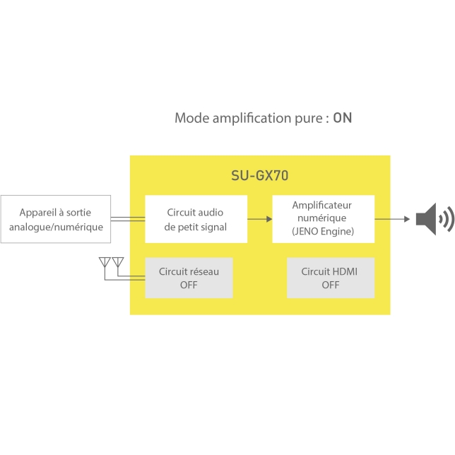 Le SU-GX70 utilise une alimentation électrique de commutation à grande vitesse de 130 kHz environ. À travers l’augmentation de la fréquence de commutation, l’interférence du bruit sur la bande passante de lecture de musique est réduite. Ceci permet une alimentation électrique très réactive pour les signaux musicaux, ainsi qu'une capacité de haut-parleur puissante.