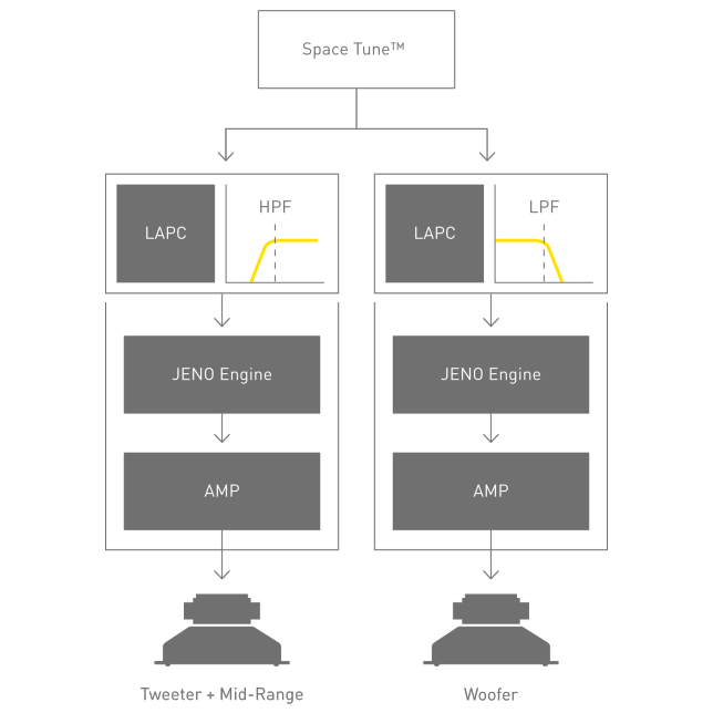 De LAPC-technologie wordt zelfs toegepast om de geluidskarakteristieken te beheren om "Space Tune™" te realiseren voor het corrigeren van wijzigingen in de frequentiekarakteristieken die als gevolg van de installatieomstandigheden tijdens het daadwerkelijke gebruik optreden.
