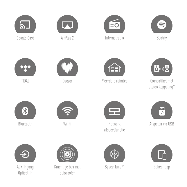 De Google Cast™ functie ondersteunt een breed scala aan muziekstreamingsdiensten voor eenvoudig casten vanuit een smartphone-app. En aangezien de gegevens rechtstreeks naar de hoofdeenheid worden gestreamd, neemt de geluidskwaliteit niet af en kan de gebruiker kiezen uit een gevarieerd muziekaanbod.