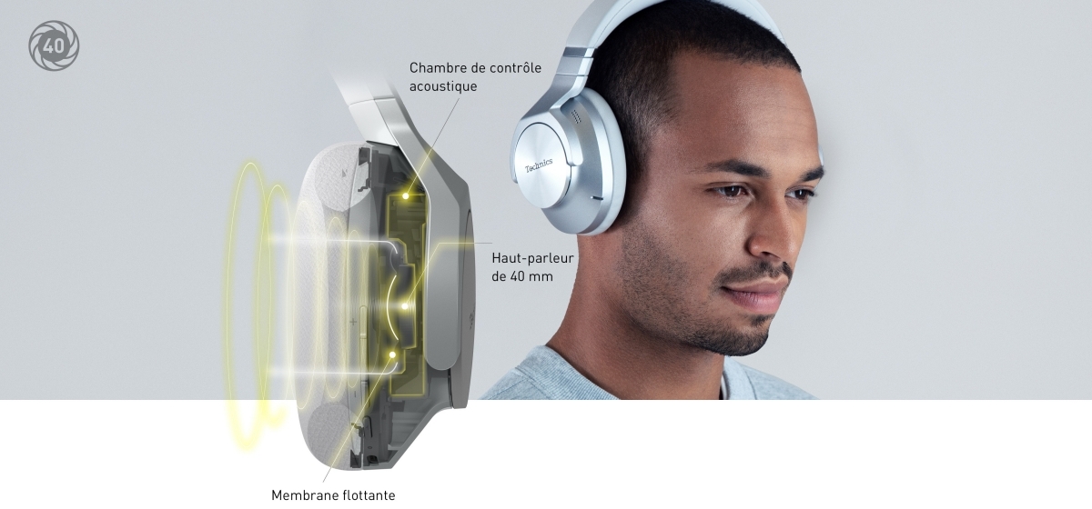 - Une expérience sonore claire et immersive avec une sensation d’amplitude et de profondeur. Le haut-parleur de 40 mm à membrane à 3 couches en PEEK/Polyuréthane vous permet de vous laisser emporter par des graves riches et des nuances précises.