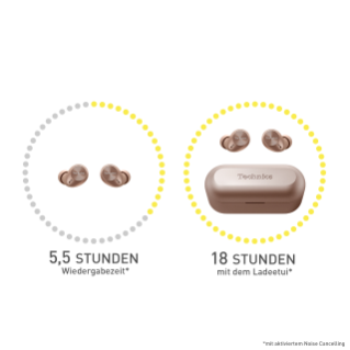 Bis zu 5,5 Stunden* Wiedergabe mit eingeschaltetem ANC, 18 Stunden Back-up mit dem Ladeetui. Mit 15 Minuten Schnellladung erhalten Sie 60 Minuten Wiedergabezeit.