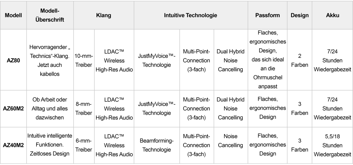 * Das Logo „Hi-Res Audio Wireless“ wird unter Lizenz der Japan Audio Society verwendet. *LDAC und das LDAC-Logo sind Marken der Sony Corporation. *Amazon, Alexa und alle zugehörigen Logos sind Marken von Amazon.com, Inc. oder seinen Partnern. Alexa ist in einigen Sprachen und Ländern nicht verfügbar. Die Eigenschaften und Funktionen von Alexa können je nach Standort variieren. * Google, Android und Google Play sind Marken von Google LLC. * Die Bluetooth®-Wortmarke und -Logos sind eingetragene Marken der Bluetooth SIG, Inc. und die Verwendung dieser Marken durch die Panasonic Corporation erfolgt unter Lizenz. Andere Marken und Markennamen sind Eigentum ihrer jeweiligen Inhaber.