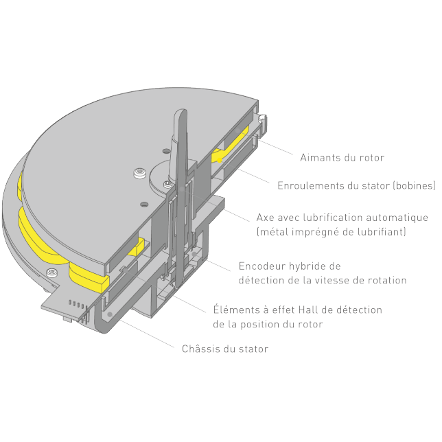 Grâce à la technologie de commande du moteur développée pour les appareils Blu-ray et à l'activation du mode d'entraînement qui dépend du statut de fonctionnement du moteur, vous profitez d'un couple de démarrage élevé et d'une stabilité à haute vitesse.