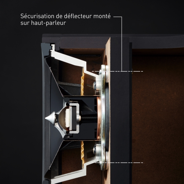 La collerette acoustique de forme originale est positionnée sur le côté avant du diaphragme du tweeter et assure une capacité de reproduction de son haute résolution sur large bande ainsi qu’une large scène sonore.