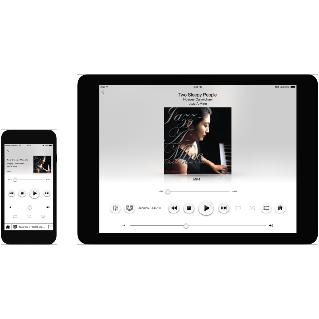 L’application Technics Music App permet de sélectionner une source musicale, l’appareil de lecture, et de créer facilement une liste de lecture sur un smartphone ou une tablette. Technics Music App permet d’accéder à son serveur DLNA, au contenu du smartphone ou de la tablette et au contenu d’une clé USB connectée à l’appareil, donnant ainsi un contrôle de lecture total.