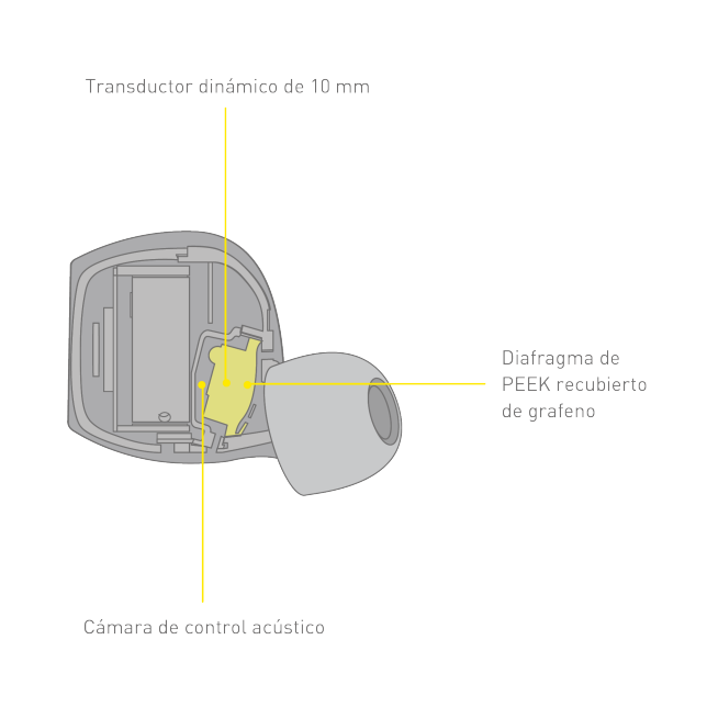 Estos audífonos verdaderamente inalámbricos usan un transductor dinámico ancho de ⌀10 mm, que genera un amplio entorno acústico. Esto facilita la generación de graves, la creación de un amplio campo de sonido y una percepción espacial que suena como si proviniera de altavoces mucho más grandes.