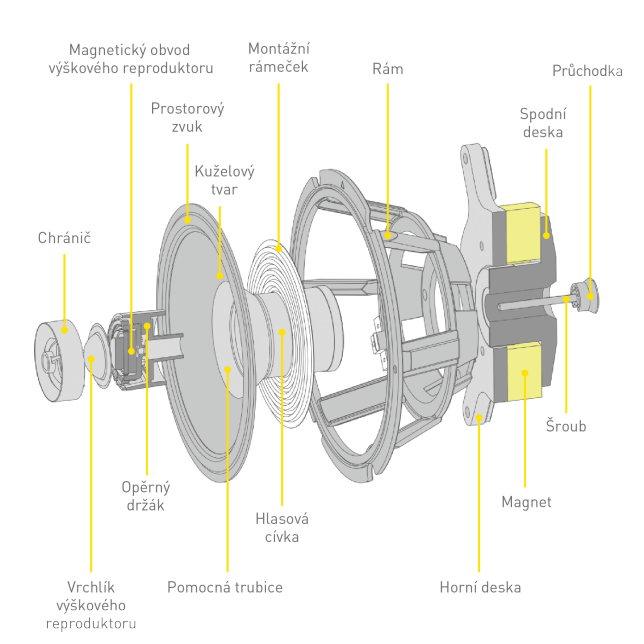 - Hloubkový reproduktor o průměru 16 cm s nízkým zkreslením a velkým rozkmitem