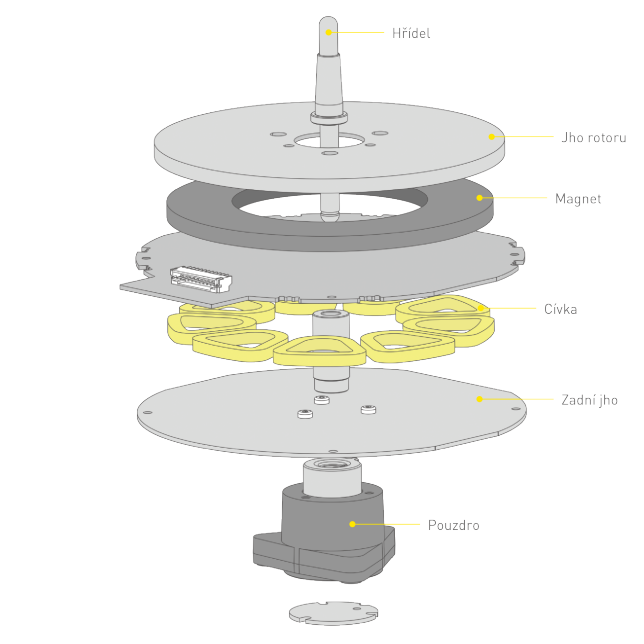- Bezjádrový motor pro přímý pohon zajišťující stabilitu otáček