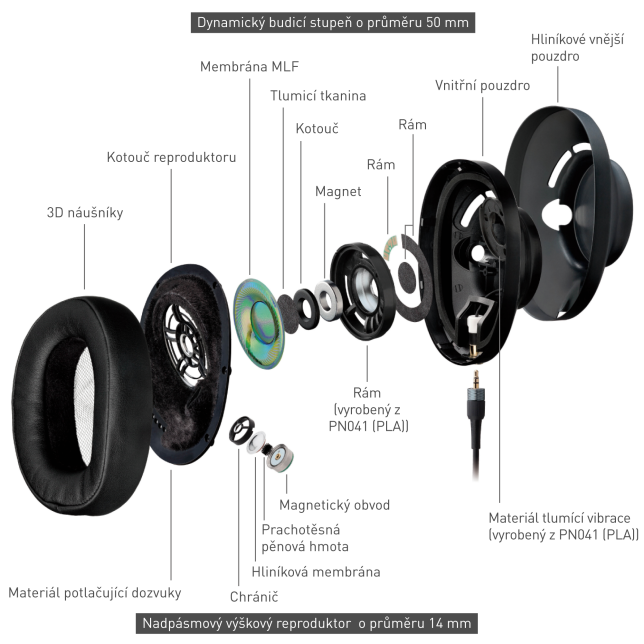 - Dynamický širokopásmový reproduktor o velikosti 50 mm vybavený technicky vyspělou membránou MLF