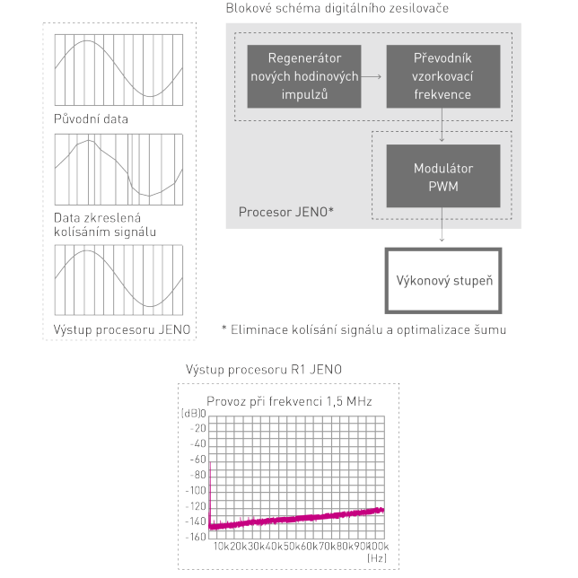 - Procesor JENO Engine (Jitter Elimination and Noise-shaping Optimisation - eliminace kolísání signálu a optimalizace šumu)