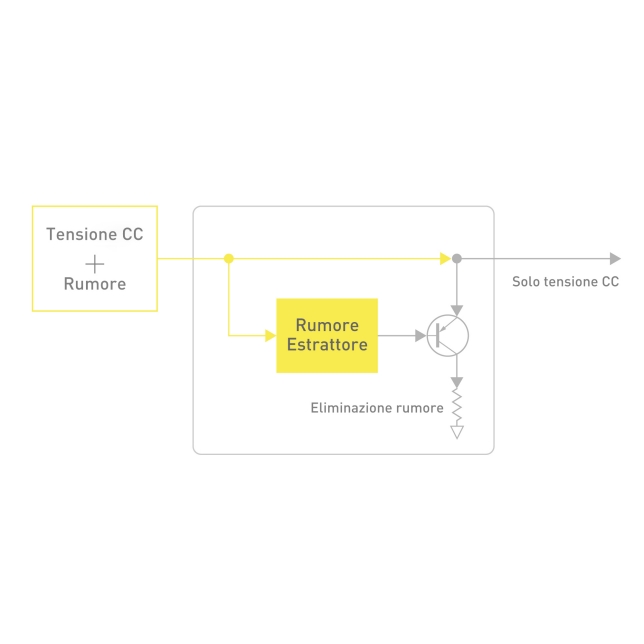 Questa tecnologia combina un dispositivo di rilevamento del rumore a un amplificatore dell'errore. Rileva il rumore residuo nell'alimentatore e applica una corrente a fase inversa per rimuovere i componenti del rumore. Rimuove il rumore a bassa frequenza in modo più efficace di un regolatore per ottimizzare l'alimentazione.