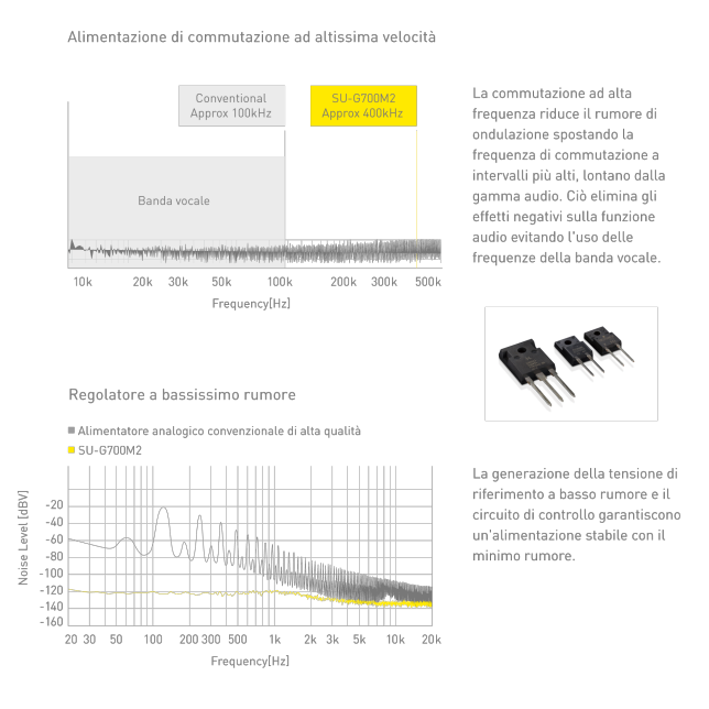 L'alimentatore potenziato del modello SU-G700M2, ispirato al nostro modello SU-R1000 di riferimento, offre un pilotaggio più potente degli amplificatori e un suono più ricco. Con una frequenza di commutazione più elevata di 400 kHz e componenti avanzati GaN FET e SiC SBD, riduce il rumore e stabilizza la potenza per un audio più nitido. Il regolatore di rumore ultra basso riduce al minimo le interferenze, garantendo un'alimentazione pulita e ad alta risposta che massimizza le prestazioni dell'amplificatore digitale. Goditi un suono più pieno e dinamico con una chiarezza eccezionale.