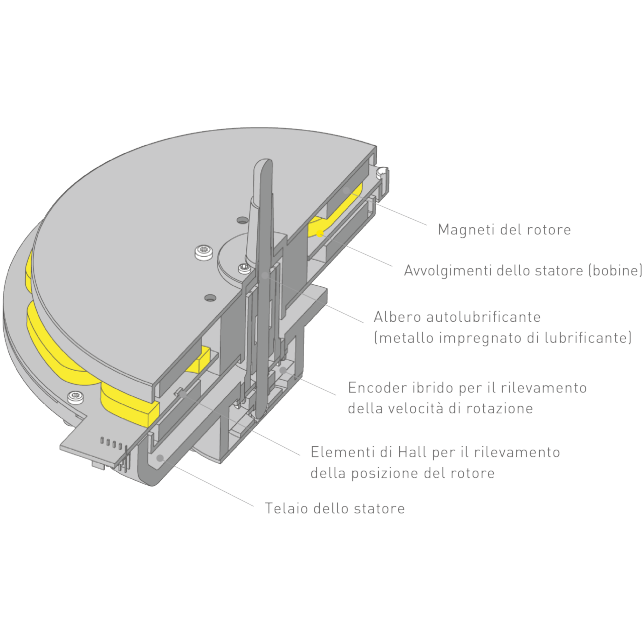 L'integrazione della tecnologia di controllo del motore sviluppata per i dispositivi Blu-ray e la commutazione della modalità di azionamento a seconda dello stato operativo del motore permettono di ottenere una coppia di avviamento elevata e una stabilità ad alta velocità.
