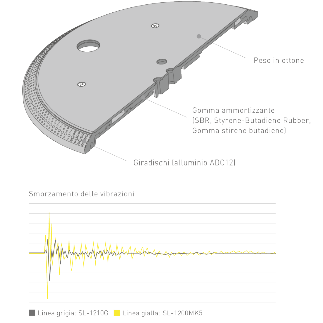 Il giradischi presenta una struttura a tre strati, con un piatto pressofuso in ottone e alluminio ad alta rigidità. La parte posteriore è completamente rivestita da uno strato ammortizzante in gomma, per eliminare la risonanza superflua, in modo da smorzare le vibrazioni e garantire un alto livello di rigidità. Questo consente di ottenere una stabilità di rotazione uniforme e una massa inerziale superiore a quella del modello SP-10MK2, il giradischi a trazione diretta adottato come standard dalle emittenti di tutto il mondo, e pari a più del doppio di quella del modello SL-1200MK5.