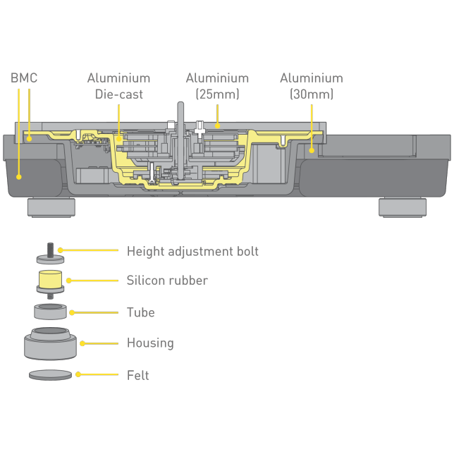 The cabinet has a 2-layer construction consisting of BMC (bulk molding compound) and a 30-mm-thick aluminium top panel. The turntable part is a 3-layer construction comprising BMC, aluminium die-cast, and a 25-mm-thick aluminium top panel. This gives the system a construction of 5 layers of different materials to ensure sufficient rigidity. The insulator that supports the cabinet is a special silicon rubber that combines high vibration damping characteristics and long-term reliability. Reinforcement with a cylindrical tube made of a microcell polymer absorbs vibrations in the horizontal direction. These parts are contained in a zinc die-cast housing with high specific gravity, for isolation from external vibrations.