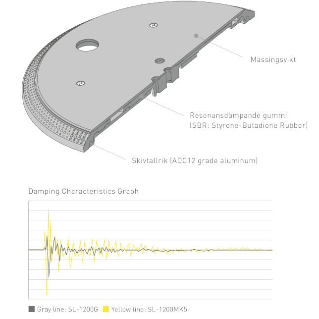 Skivspelaren har en trelagers-konstruktion med skivtallrik i vridstyv kombination av mässing och gjuten aluminium. Hela baksidan har täckts med gummidämpning för att släcka ut oönskade resonanser. Den solida och dämpade tallriken ger en följsam och stabil rotation med mer tröghetsmassa än SP-10MK2, den direktdrivna skivspelare som bildat norm på radiostationer över hela världen. Den har också mer än dubbla tröghetsmassan jämfört med SL-1200MK5..