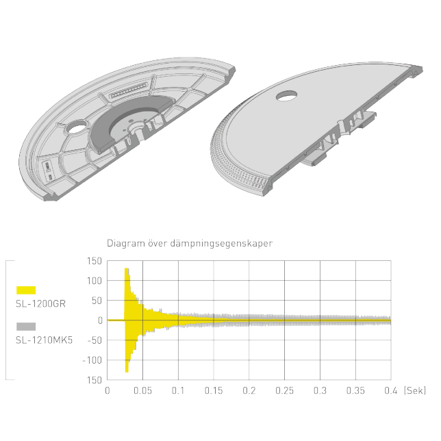 För att öka tröghetsmassan och minska vibrationer, har formen på det formgjutna aluminiumet optimerats genom simulering. Skivtallriken på SL-1210GR väger 2,5 kg (inklusive gummimattan) och är 0,8 kg tyngre än hos den tidigare SL-1200MK5. Tallrikens bakre yta har även förstärkningsribbor för att förbättra styvheten. Ökning av ytans kontaktområde med hämmande gummi uppnår dämpande egenskaper som är mer än dubbelt så stora som för SL-1200MK5.